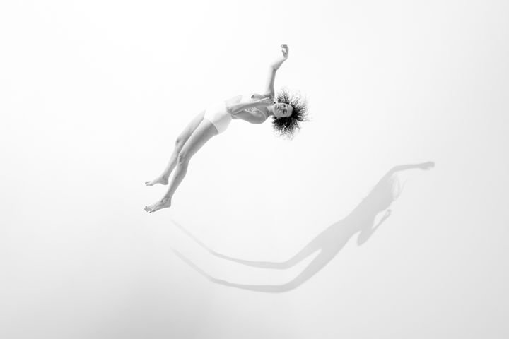 "Lévitation" Évoque un moment suspendu, sans tricherie. Plongeon solitaire ou à deux dans un moment de grâce et de lâcher prise où les corps semblent flotter au-dessus de l'ombre de leur être. Cette série vient perturber la perception sans besoin de Photoshop, bouscule les codes esthétiques pour en questionner le sens.